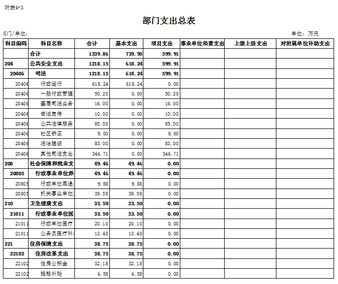 2022年预算总支出1339.86万元,其中:行政运行(司法)预计支出618.24万元,普法宣传支出10万元,基层司法业务支出16万元,法律援助支出10万元,社区矫正支出9万元,法制建设支出83万元,行政单位离退休支出9.88万元,机关事业单位基本养老保险缴费支出39.17万元,行政事业单位医疗支出33.5万元,住房保障支出38.75万元。2022年总支出较上年增加了61.86万元,增加了约26%,主要原因是:因为人员工资基数较上年进行了调整。