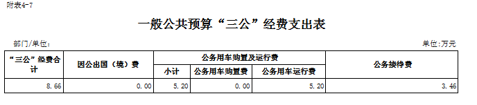 部门“三公”经费年初预算总额8.66元,其中公务车运行维护费5.2万元,公务接待费2.96万元。