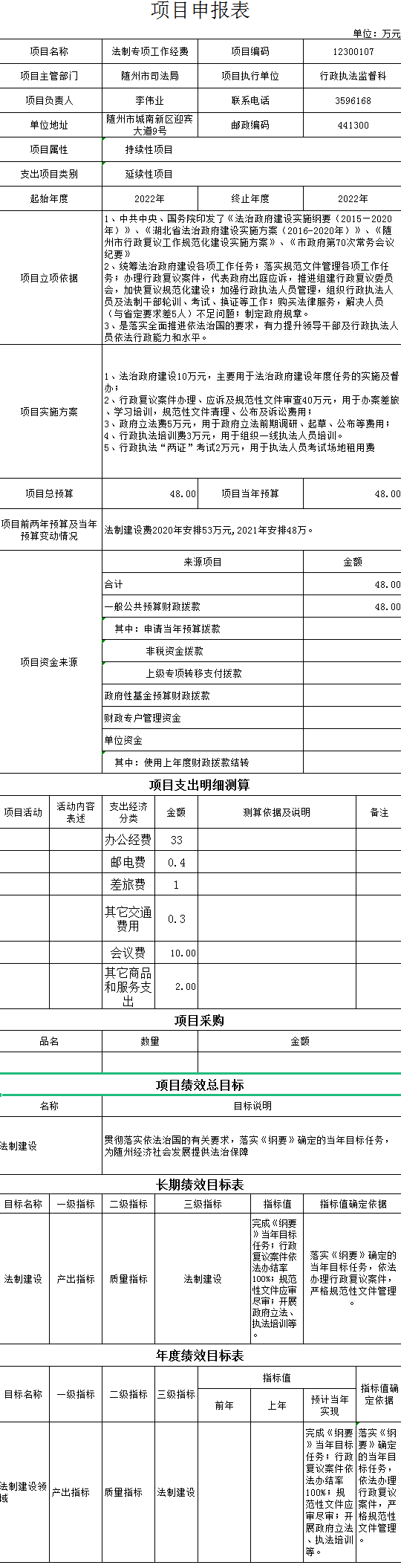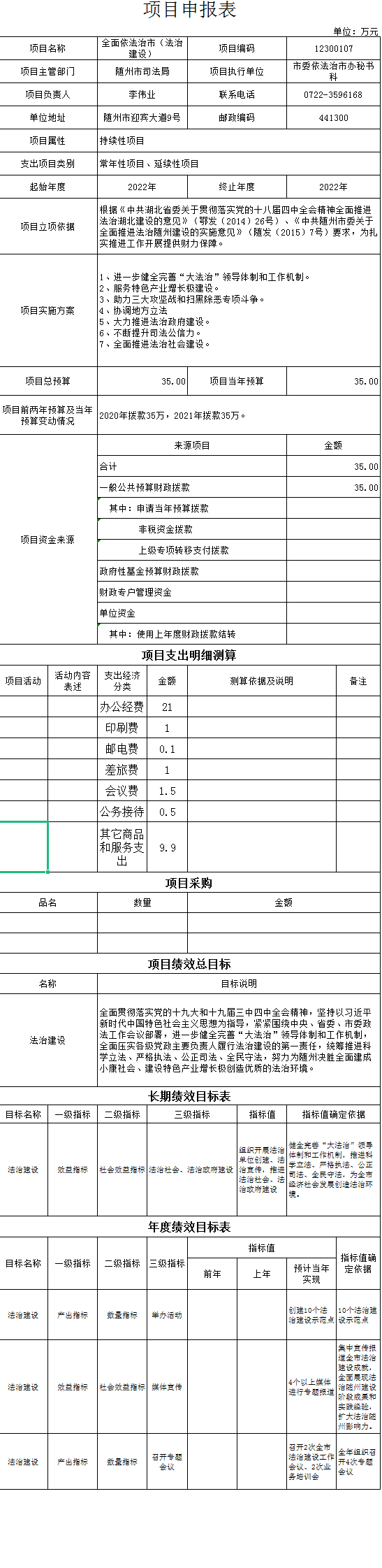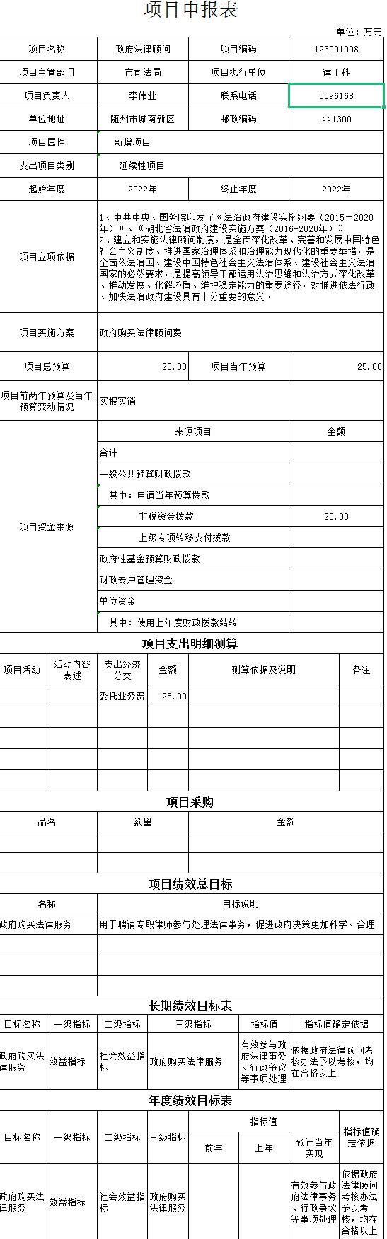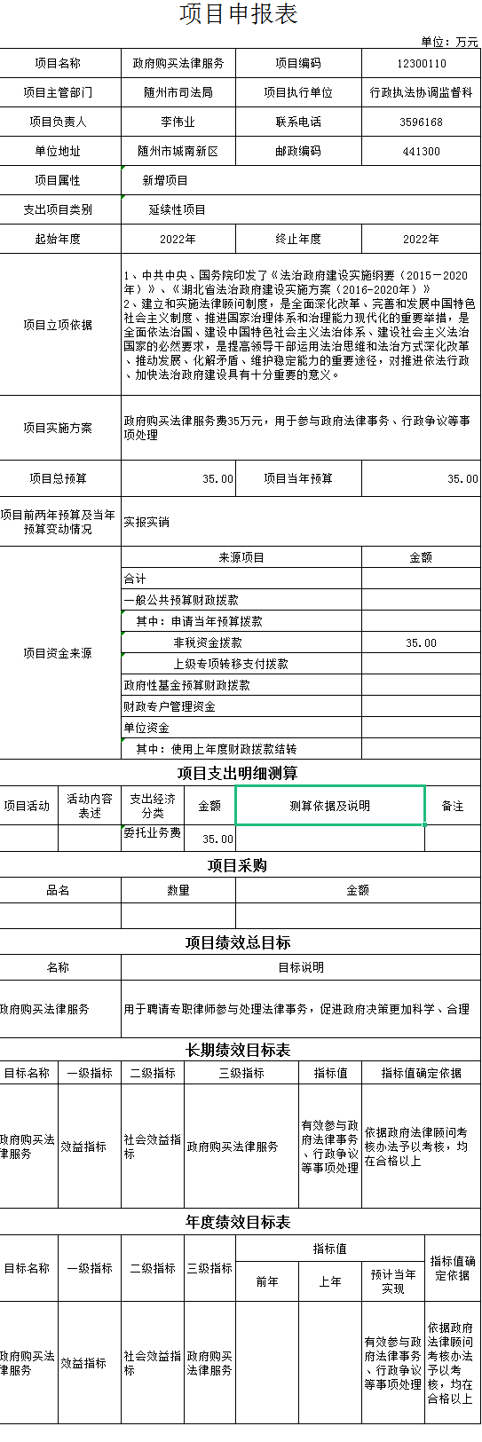 项目绩效指标设置:对政府拟出台的规章进行合法性审查,对出台的政府规范性文件按程序报备。