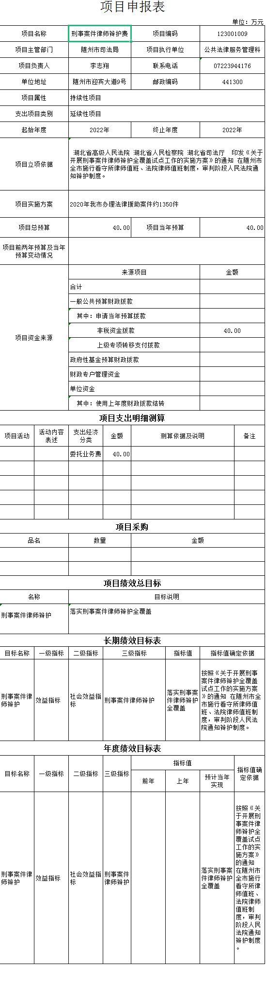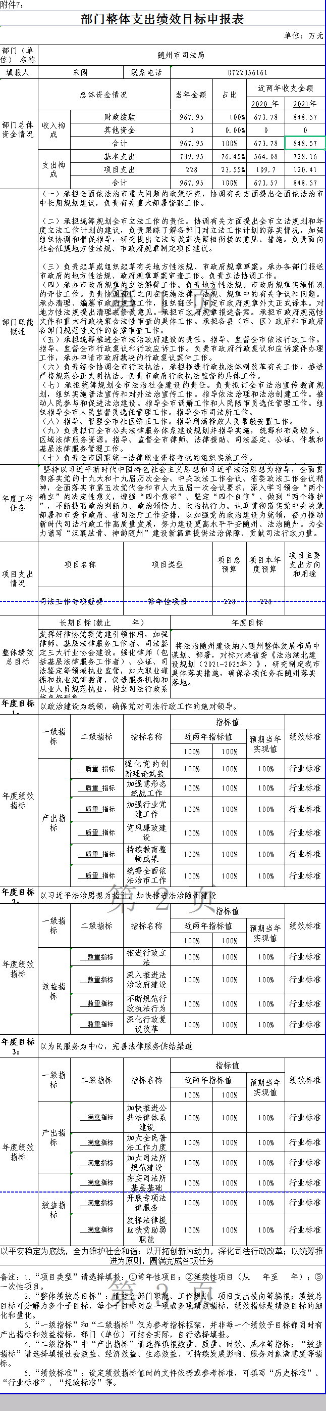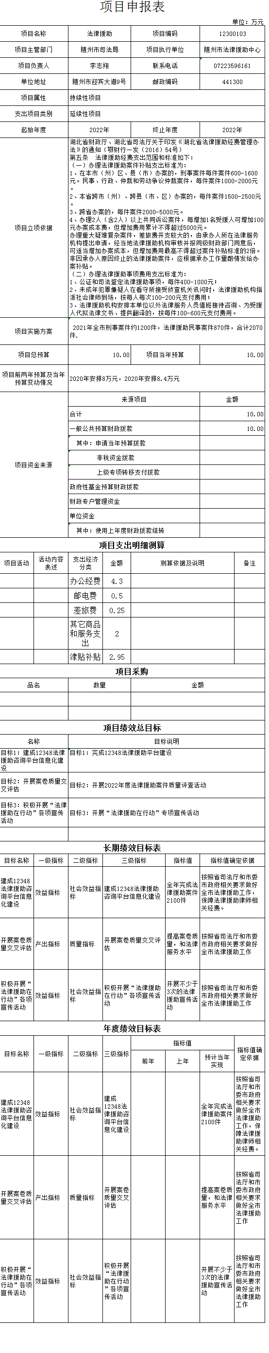 绩效目标:1、基本支出主要用于保障机关工作人员各项工资支出及司法行政工作正常运转的各项费用。2、项目支出包括法律援助、法制随州建设、法制专项工作、社区矫正、普法宣传、医调委、人民监督员选任管理及人民调解等各项基层司法业务支出,主要用于保障基层各项业务的更好开展。3、2022年我局将致力于在全社会营造良好的法治氛围,全力维护社会稳定,并进一步为人民群众提供优质的法律服务。
