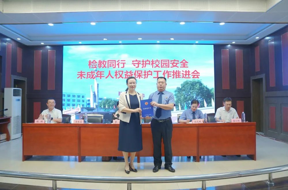 会上,市政府副市长罗兰为市检察院代理检察长盛勇颁发“随州一中法治副校长”聘书,盛勇向市教育局局长王桂兰送达检察建议书。随州一中党委副书记童以刚就进一步加强校园安全建设、做好未成年人保护工作作表态发言。