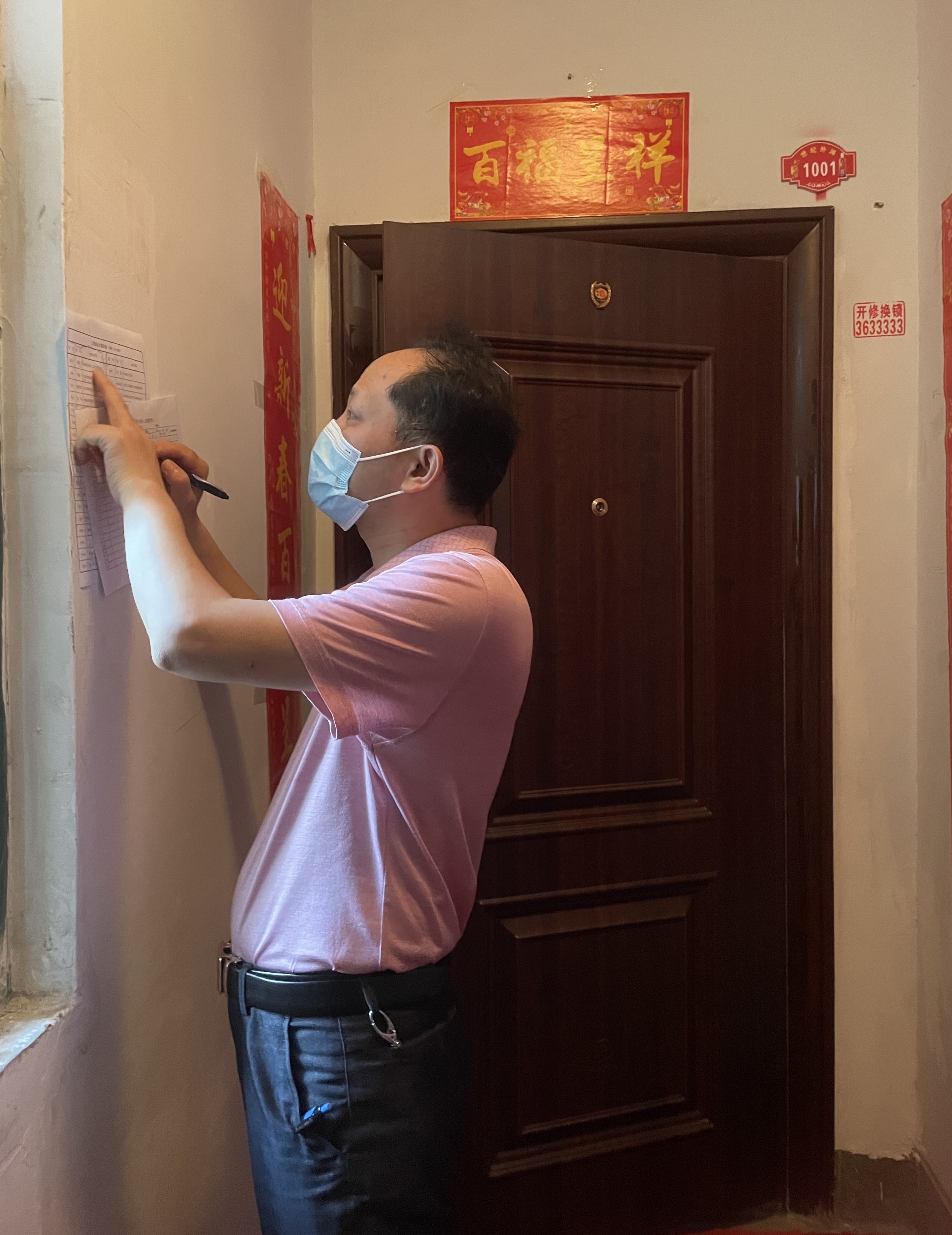 “我们这次被分配到的东兴社区世纪外滩是个老小区,虽然楼层不高,但是没有电梯,要一直上上下下,天气又热,来来回回,身上的衣服很快都湿透了。”时间紧,任务重,大家来不及考虑那么多,拿着笔和纸就径直奔向各自的包保楼栋。由于是老旧小区,绝大部分门也没有安装门铃,都是靠手敲门,敲1个2个还行,连续不断敲几十户,很多同志刚开始没经验,手都敲肿了,这才有了之前工作群里同志的“诉苦”,但即使这样,大家没有一个打退堂鼓的,仍然不落一栋,不落一户的排查过来。