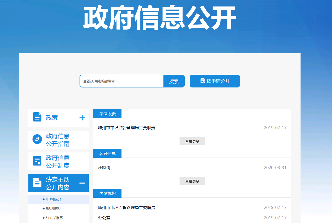 公开行政许可及服务信息。通过湖北政务服务网集中公开办理行政许可和其他对外管理服务事项的依据、条件、程序。通过市场监管局网站行政许可栏目及时公开食品、药品、医疗器械、及企业登记注册办理结果。