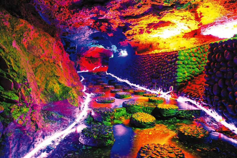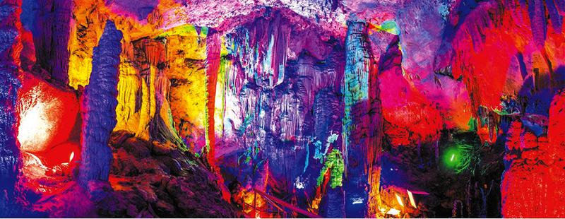 走过梅花桩,便来到第二厅——罗汉堂。此厅以石柱高大,石笋众多,边石堤坝瑰丽而引人注目。厅中央的一个需要几个人合围的大石笋,最为引人注目。它高50余米,顶天立地,周围有数十根小石柱竞相争立。大石笋旁还有众多顶部圆滑的大小石笋,它们形似形态各异的罗汉。有的“面目清秀,气质文雅”;有的“温柔娴静,典雅大方”;有的“敦敦实实,神采奕奕”;有的“老态龙钟,萎靡不振”;有的“须眉交白,凝神沉思”;有的“挤在一起,窃窃私语”……大家可以凭自己的观察力,为各种形态的石笋起出更多的名字来。