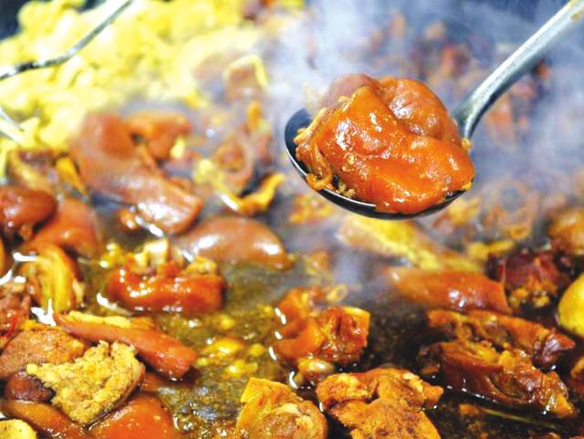 人们常说,鱼与熊掌不可兼得,但拐子饭却实现了“鱼与熊掌可兼得”:猪的右后腿掌管着方向和驱动,兼具着智慧和力量,拐子饭的精妙之处就在于“猪脚”。猪脚含有丰富的胶原蛋白质,维生素A、B、C及钙、磷、铁等营养物质。营养学家介绍,猪脚经过卤制,其富含蛋白质水解所产生的胱氨酸、精氨酸等11种氨基酸之含量均与熊掌不相上下。因此,从营养价值上来讲,香卤猪脚并不亚于熊掌。