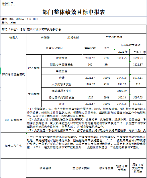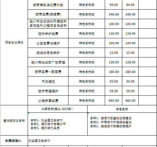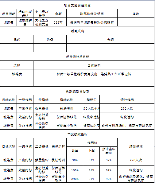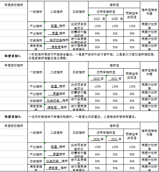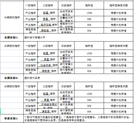 1、本部门整体绩效目标是:长期目标有3个,目标1、创国家卫生城市; 目标2、提升城市管理水平;3、提升城市品质。年度目标有3个,目标1、推进市政基础设施建设; 目标2、开展城市环境综合整治;目标3、推进城市管理效能提升。