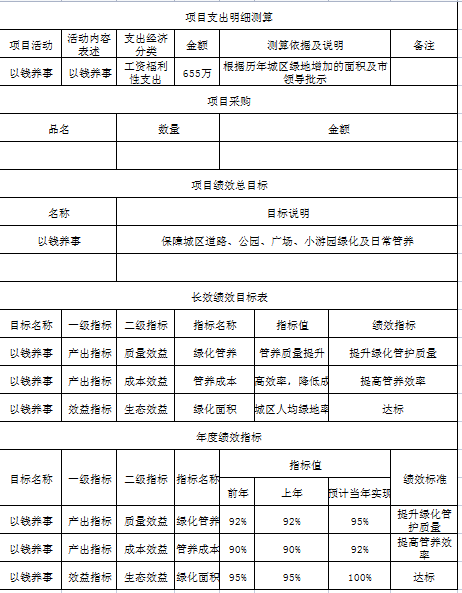 2、项目绩效总目标是:保障园林单位人员工资,提高园林绿化管护质量,改善城区生态环境。