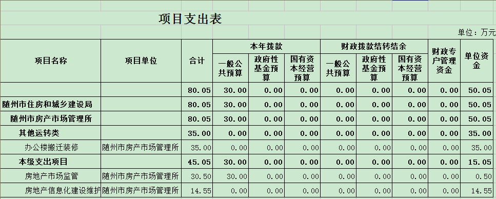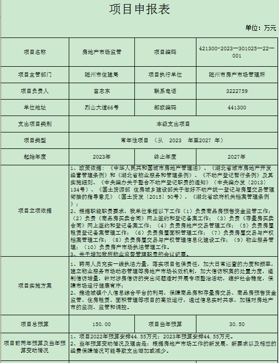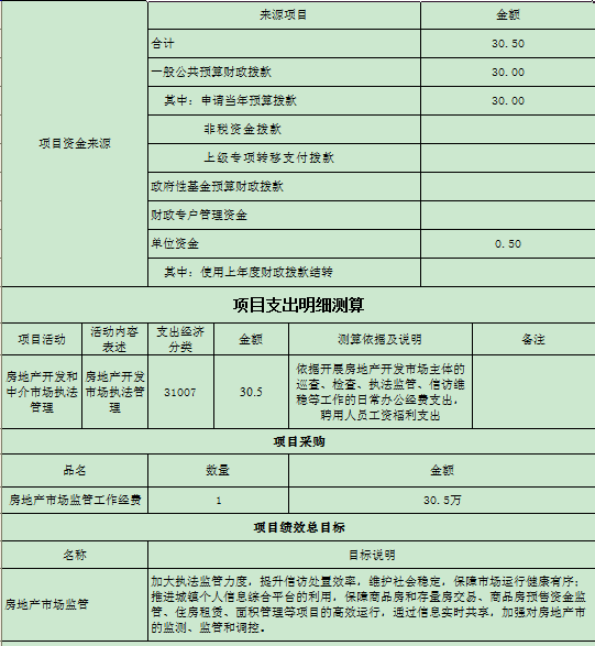 (1)房地产市场监管项目主要内容是:项目实施旨在加大执法监管力度,提升信访处置效率,维护社会稳定,保障市场运行健康有序;2023年预算安排30.5万元,其中:30万元资金来源为当年一般公共预算财政拨款(补助)资金。0.5万元资金来源为单位自筹资金。