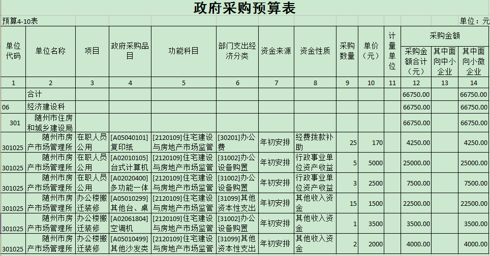 2023年本单位政府采购预算安排合计6.67万元,将全部面向中小企业及小微企业,采购比例100%,均为复印纸、台式电脑和多功能一体机、办公桌椅、空调等货物采购,较上年1.92增加4.75万元,同比上升247%,原因是当年办公楼搬迁及部分办公设备老旧报废预计会更新添置部分办公家具和办公设备。