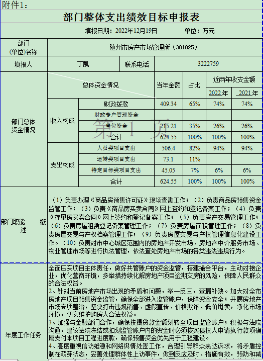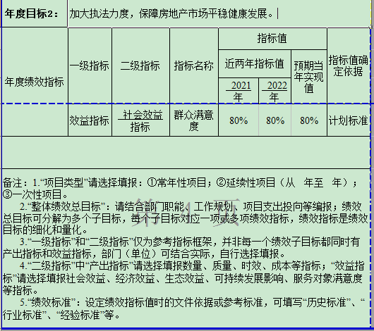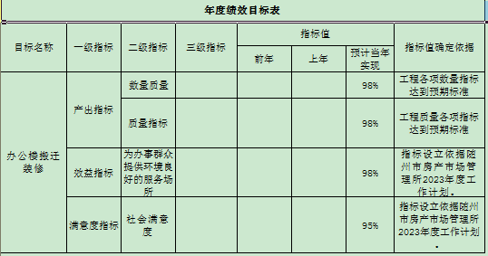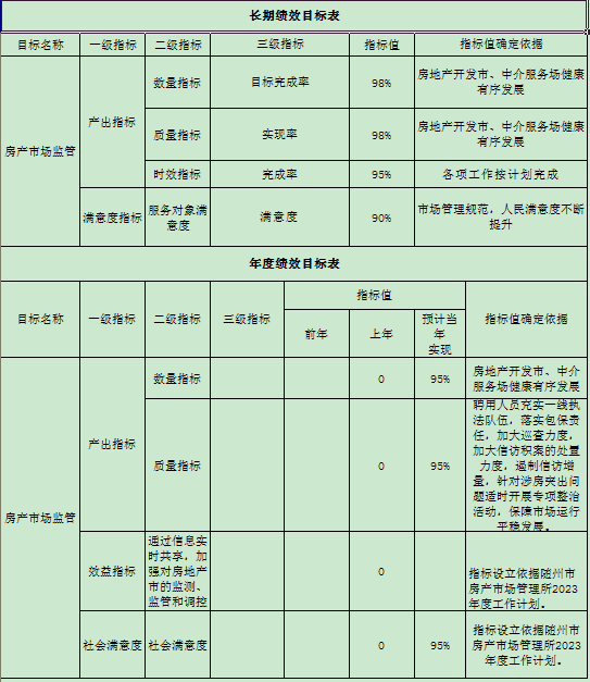 1、本部整体绩效目标是:长期目标为(1)推动信息化建设,提升房产管理水平和公共服务能力.(2)加大执法力度,保障房地产市场平稳健康发展。年度目标为(1)推动住房信息系统建设,提升房产管理水平和公共服务能力;(2)加大执法力度,保障房地产市场平稳健康发展。