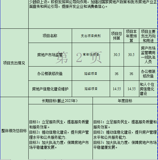 (2)项目绩效总目标是:加大执法监管力度,提升信访处置效率,维护社会稳定,保障市场运行健康有序;推进城镇个人信息综合平台的利用,保障商品房和存量房交易、商品房预售资金监管、住房租赁、面积管理等项目的高效运行,通过信息实时共享,加强对房地产市的监测、监管和调控。