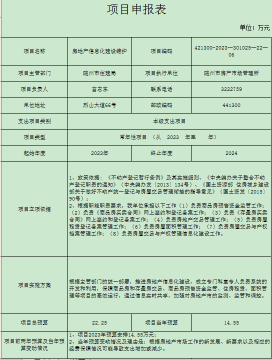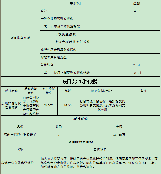 (1)房地产信息化建设维护项目的主要内容为推进城镇个人信息综合平台的利用,促进商品房和存量房交易、商品房预售资金监管、住房租赁、面积管理等项目监管的安全、高效运行,通过信息实时共享,加强对房地产市的监测、监管和调控。2023年预算安排14.55万元,资金来源全部为单位自筹资金。