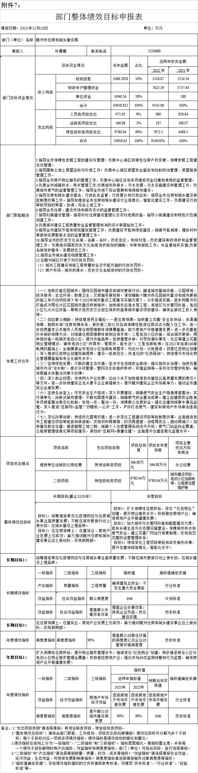 本部门整体绩效目标是:长期目标为统筹推进常态化疫情防控与住房城乡事业高质量发展,不断在城市更新行动上使长劲,在城乡建设上提品质。在住房保障上,在建筑业、房地产业发展上见成效,奋力推动随州住房和城乡建设事业迈上新台阶、实现新跨越。