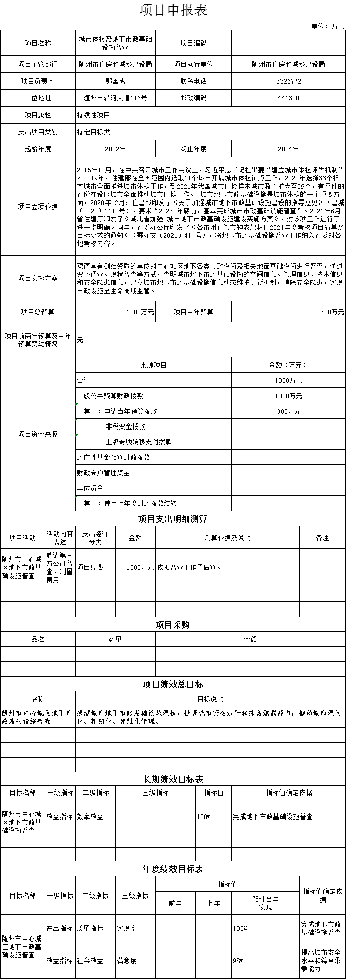 (二)1、“城市体检及地下市政基础设施普查”项目主要内容是聘请具有测绘资质的单位对中心城区地下各类市政设施及相关地面基础设施进行普查,通过资料调查、现状普查等方式,查明城市地下市政基础设施的空间信息、管理信息、技术信息和安全隐患信息,建立城市地下市政基础设施信息动态维护更新机制,消除安全隐患,实现市政设施全生命周期监管。2023年预算安排300万元,资金来源为当年一般公共预算资金。