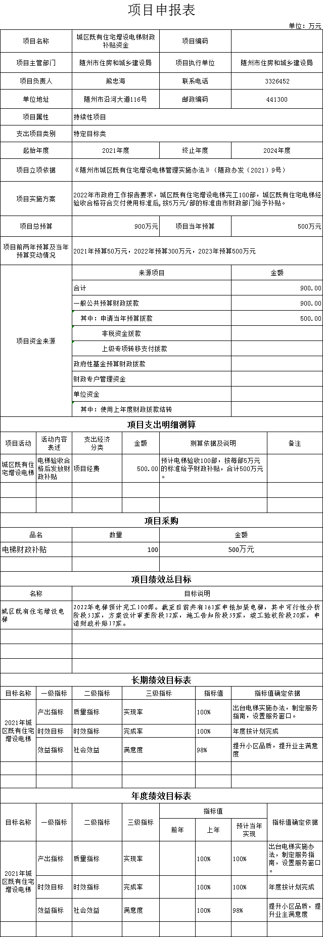 (一)1、“城区既有住宅增设电梯财政补贴资金”项目主要内容是2022年市政府工作报告要求,城区既有住宅增设电梯完工100部,城区既有住宅电梯经验收合格符合交付使用标准后,按5万元/部的标准由市财政部门给予补贴。2023年预算安排500万元,资金来源为当年一般公共预算资金。