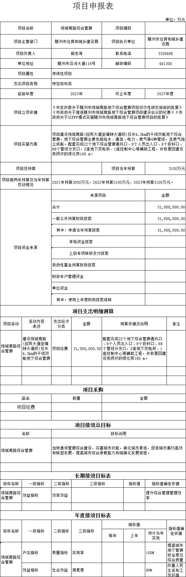 (五)1、“绕城南路综合管廊”项目主要内容是建设绕城南路(迎宾大道至编钟大道段)总长4.3km的干线双舱地下综合管廊,地下综合管廊主要包括给水、通信、电力、燃气等4种管线,且燃气独立成舱。配套完成22个地下综合管廊通风口、9个人员出入口、9个投料口、86个管线分支口,2座地下变电所、1座控制中心等辅助工程,并恢复因建设而损坏的绿化带160 m。2023年预算安排3100万元,资金来源为当年一般公共预算资金。