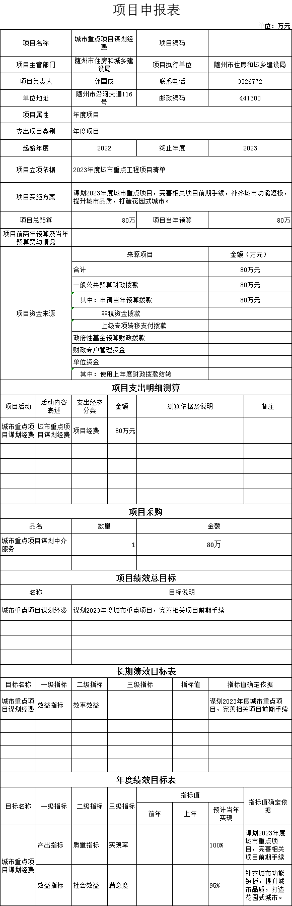 (三)1、“城市重点项目谋划经费”项目主要内容是谋划2023年度城市重点项目,完善相关项目前期手续,补齐城市功能短板,提升城市品质,打造花园式城市。2023年预算安排80万元,资金来源为当年一般公共预算资金。