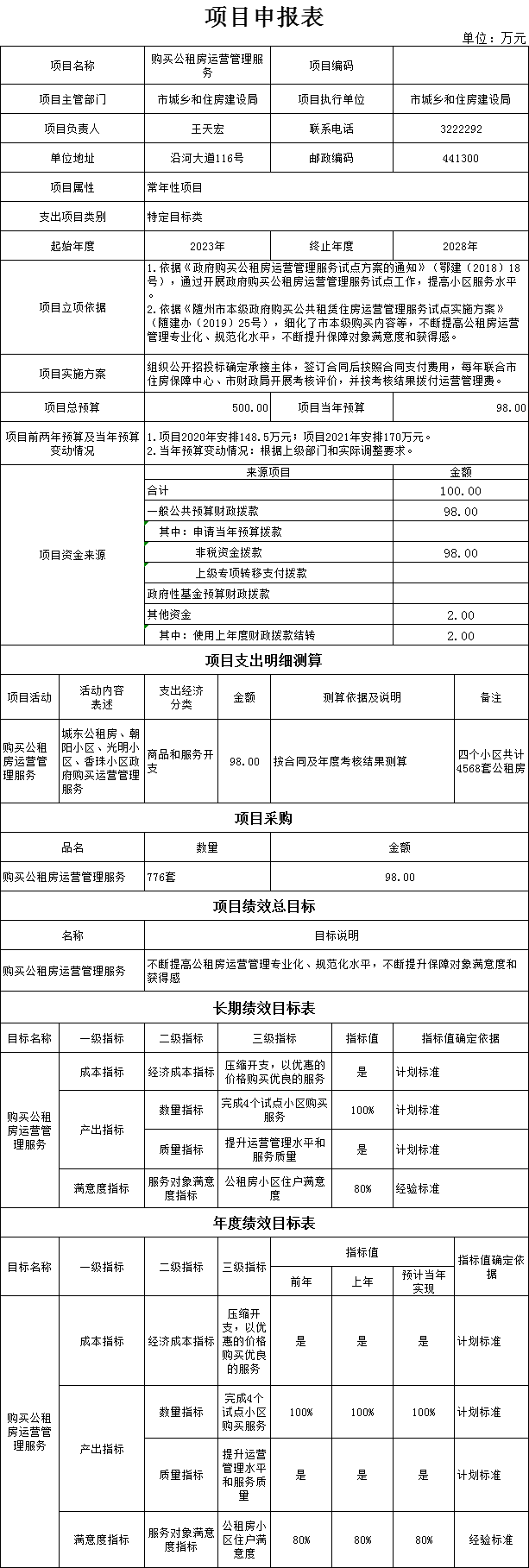 (四)1、“购买公租房运营管理服务”项目主要内容是组织公开招投标确定承接主体,签订合同后按照合同支付费用,每年联合市住房保障中心、市财政局开展考核评价,并按考核结果拨付运营管理费。2023年预算安排98万元,资金来源为当年一般公共预算资金。