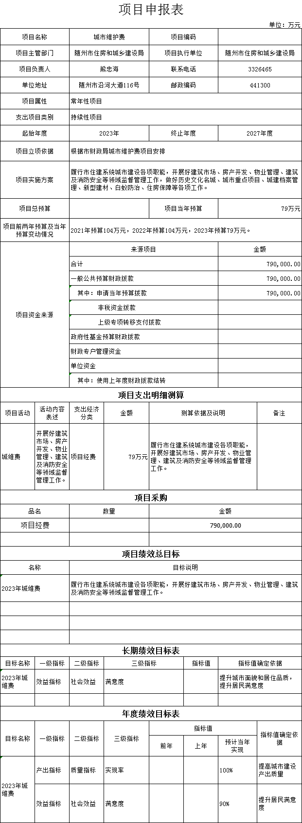 (七)1、“城市维护费”项目主要内容是履行市住建系统城市建设各项职能,开展好建筑市场、房产开发、物业管理、建筑及消防安全等领域监督管理工作,做好历史文化名城、城市重点项目、城建档案管理、新型建材、白蚁防治、住房保障等各项工作。2023年预算安排79万元,资金来源为当年一般公共预算资金。