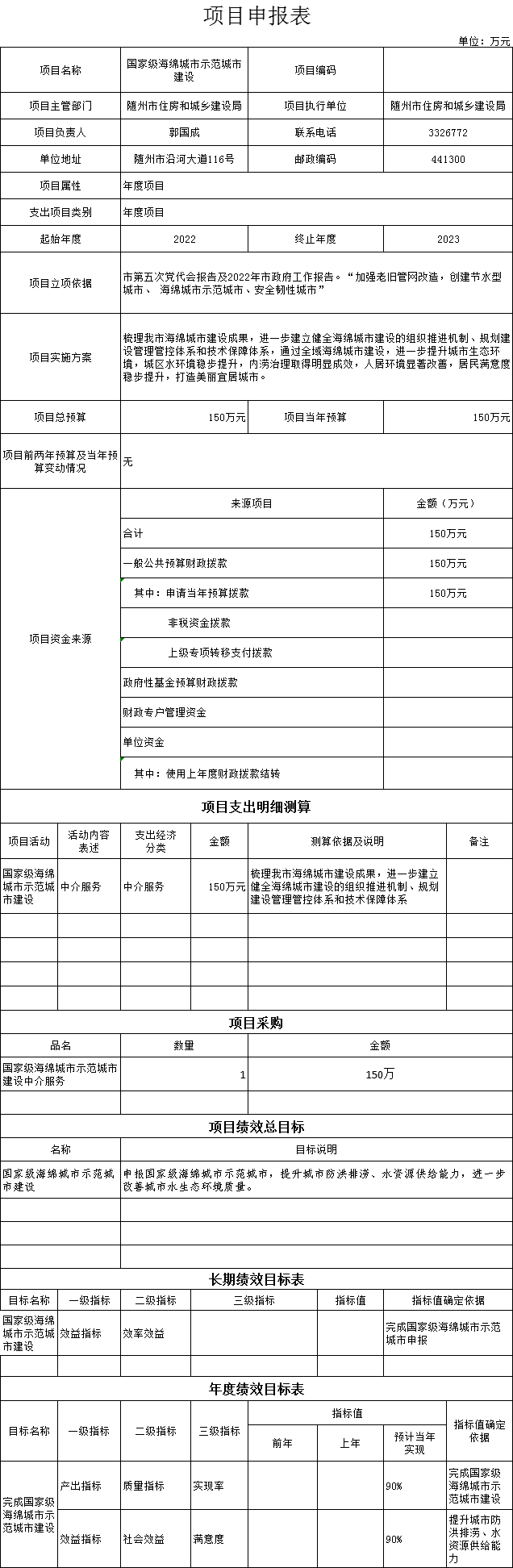 2、项目绩效总目标是:申报国家级海绵城市示范城市,提升城市防洪排涝、水资源供给能力,进一步改善城市水生态环境质量。