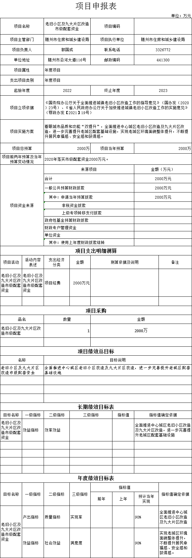 (九)1、“老旧小区及九大片区改造市级配套资金”项目主要内容是着眼城市品质和功能“双提升”,全面推进中心城区老旧小区改造及九大片区改造,进一步完善提升老城区配套基础设施,实现老城区环境面貌整体提升,不断提升居民幸福感、安全感和获得感。2023年预算安排2000万元,资金来源为当年一般公共预算资金。