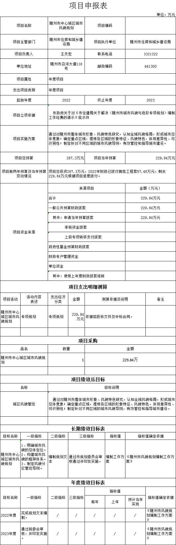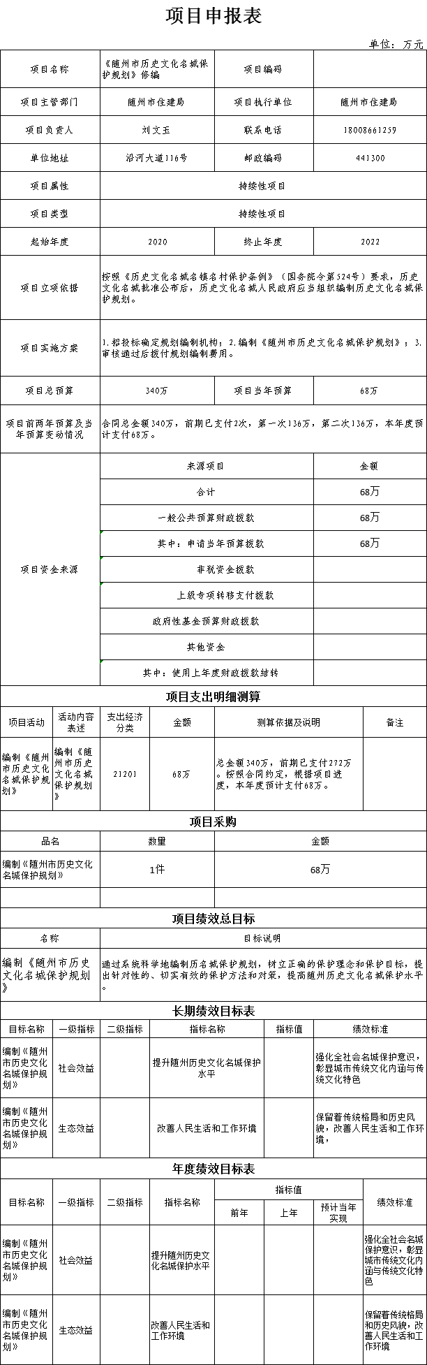 2、项目绩效总目标是:通过系统科学地编制历名城保护规划,树立正确的保护理念和保护目标,提出针对性的、切实有效的保护方法和对策,提高随州历史文化名城保护水平。