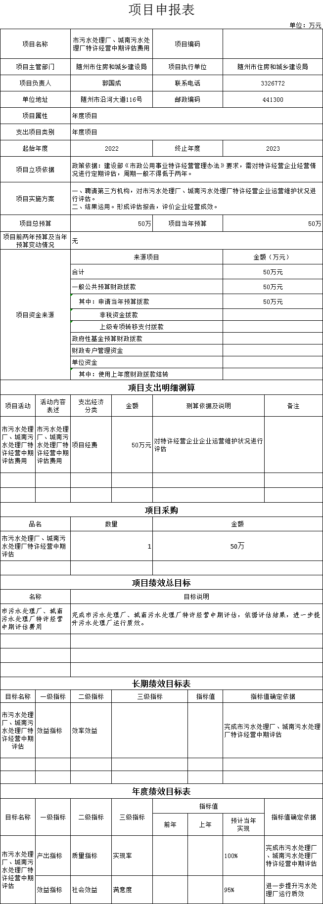 (十)1、“市污水处理厂、城南污水处理厂特许经营中期评估费用”项目主要内容是聘请第三方机构,对市污水处理厂、城南污水处理厂特许经营企业运营维护状况进行评估,形成评估报告,评价企业经营成效。2023年预算安排50万元,资金来源为当年一般公共预算资金。