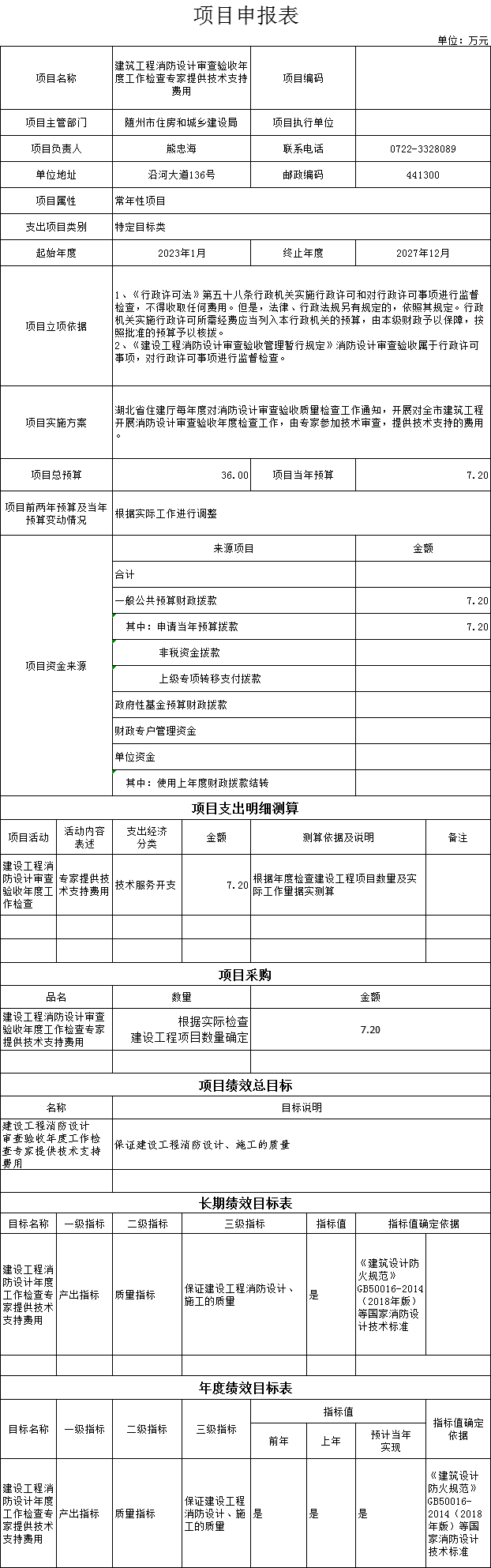 (十三)1、“建筑工程消防设计审查验收年度工作检查专家提供技术支持费用”项目主要内容是湖北省住建厅每年度对消防设计审查验收质量检查工作通知,开展对全市建筑工程开展消防设计审查验收年度检查工作,由专家参加技术审查,提供技术支持的费用。2023年预算安排7.2万元,资金来源为当年一般公共预算资金。