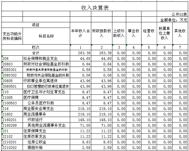 2015年部门收入283.39万元,其中财政拨款收入283.39万元。比2014年收入235.55增加48.35万元,增加原因:1、公务员预增资增加了财政拨款。部门全年支出260.87万元,其中:工资福利支出120.69万元,商品和服务支出14万元,对个人和家庭补助支出55.18万元,