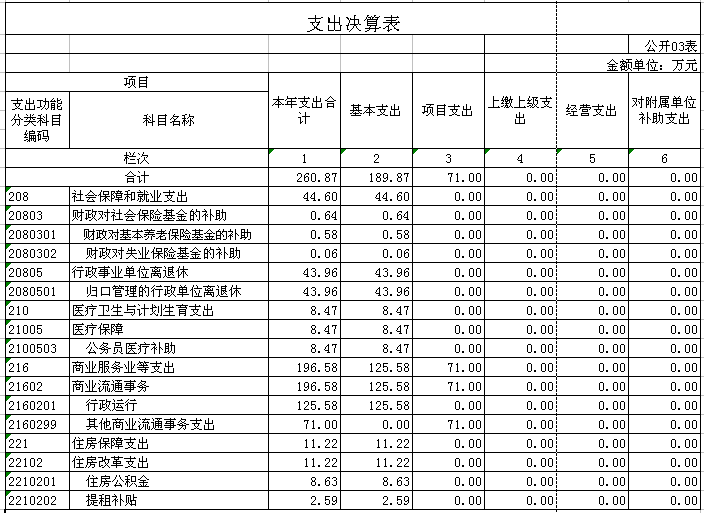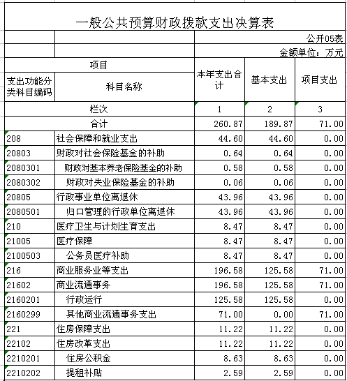 2015年财政拨款支出决算260.87万元。其中:基本支出189.87万元,用于单位正常运转的支出;项目支出71万元,用于新农村现代流通网络建设工程等项目经费的支出。