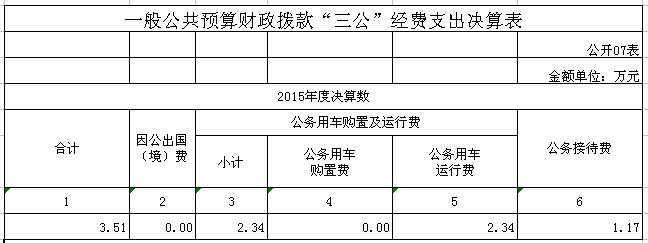 2015年“三公”经费支出3.51万元,其中公务接待费1.17万元,公车运行费2.34万元。,比2014年支出增加1.45万元。增加原因:主要为公车购买时间年限增长,保养费用增加。