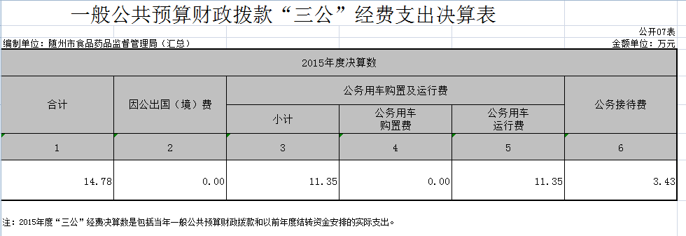 部门一般公共预算财政拨款“三公”经费总支出14.78万元,其中:公务接待费3.43万元、公车运行维护费11.35万元,无出国(境)支出。