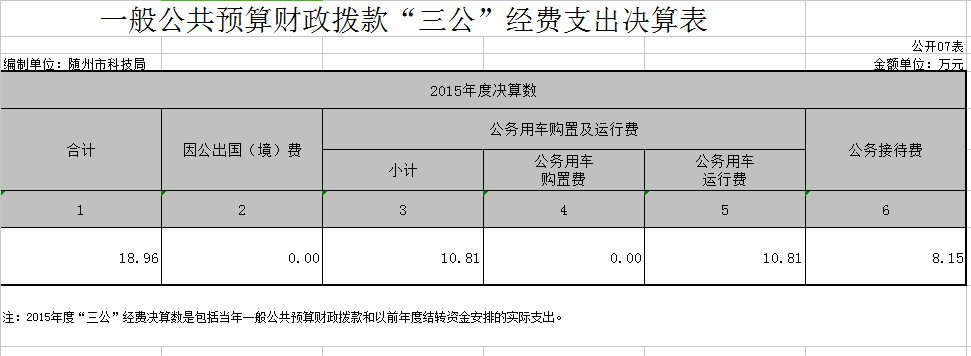 2015年度,市科技局严格执行中央八项规定和省、市有关党风廉政精神,强化支出管理,厉行节约,“三公”经费同比下降21.26%,具体为: