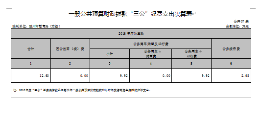 2016年“三公”经费支出12.6万元,其中:公务接待费2.68万元,公车运行费9.92万元。比年初预算24.34万元减少11.74万元,公车改革后公车运行费减少是主要原因。2016年单位公务车1辆,未新购置公务车辆。2016年公务接待费2.68万元,接待48批次,359人次。