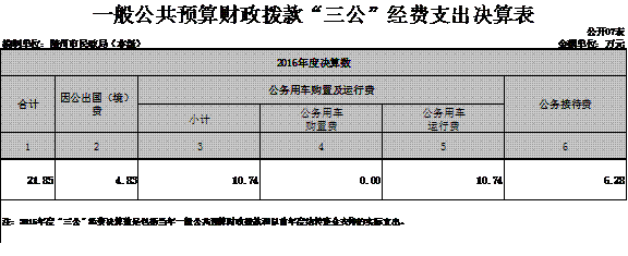 2016年,我局预算单位“三公”经费公共预算财政拨款支出21.85万元,其中:因公出国费用4.83万元、公务用车运行维护费10.74万元,公务接待费6.28万元。公务用车购置数为0,现局保有公务用车2辆。国内公务接待45批次,340余人次。