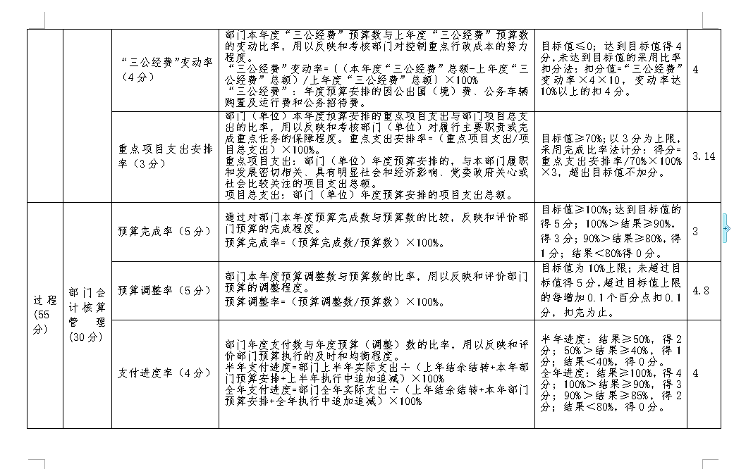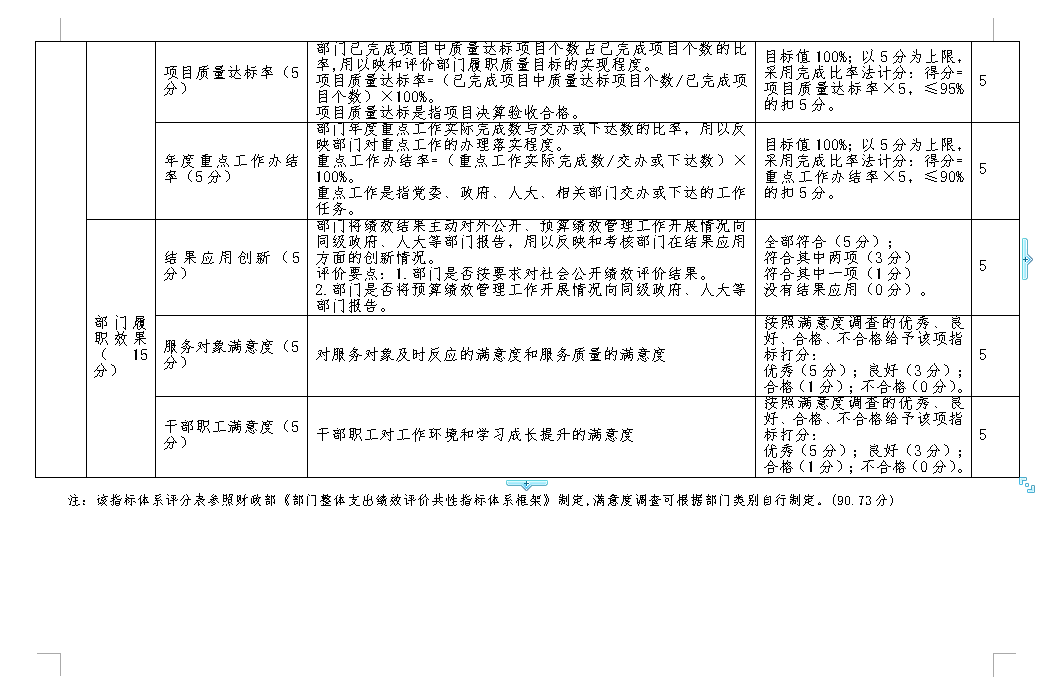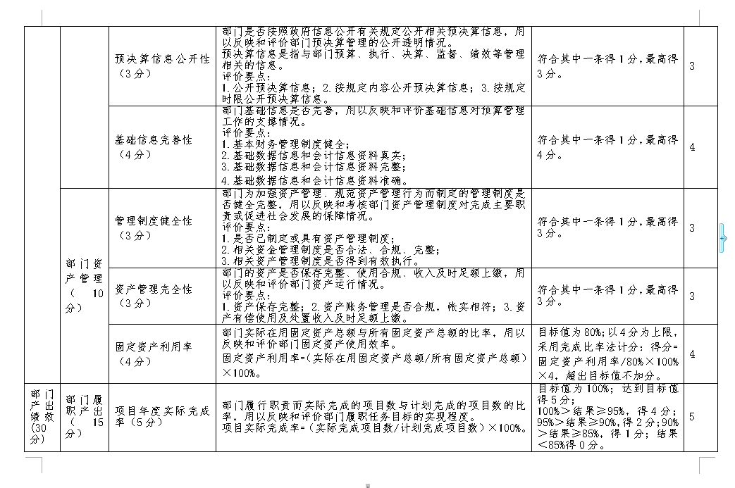 | 项目 绩效 (60分) | 项目 产出 (30分) | 预算控制(6分) | 项目施工单位是否按照预算计划全部完成。用以反映和评价项目的完成程度。 | 预算执行率超过90%计5分,每降低10%,扣2分,扣完为止 | 6 |