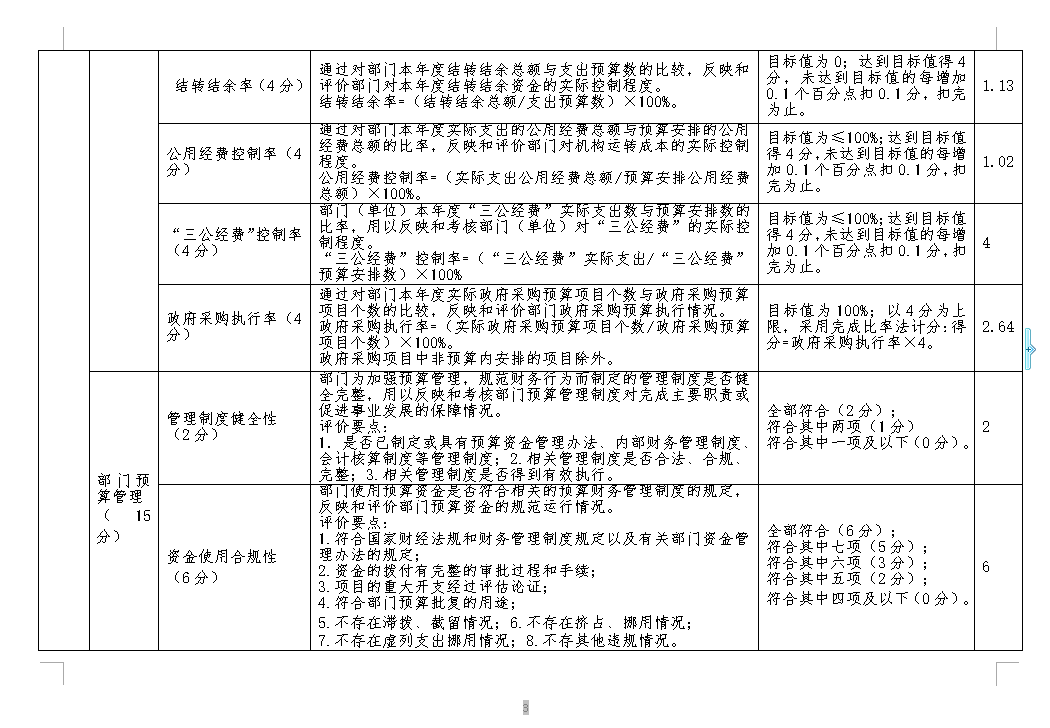 | 到位 及时率 (3分) | 及时到位资金与应到位资金的比率,用以反映和考核项目资金落实的及时性程度。到位及时率=(及时到位资金/应到位资金)×100%。及时到位资金:截至规定时点实际落实到具体项目的资金。应到位资金:按照合同或项目进度要求截至规定时点应落实到具体项目的资金 | 预算资金及时到位计3分,到位及时率每降低10%,扣1分。 | 3 | ||