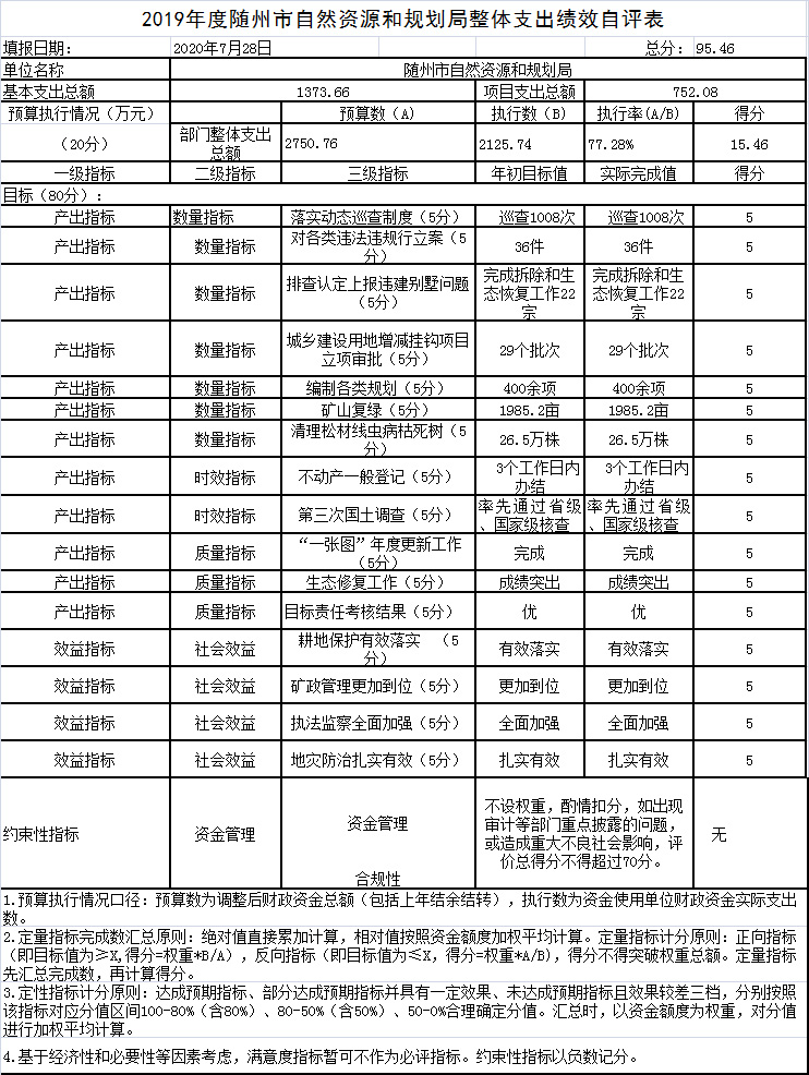 根据预算绩效管理要求,365禁用取消提款什么意思_365bet游戏下载_365体育ribo88自然资源和规划局组织对2019年度一般公共预算项目支出全面开展绩效自评,共涉及项目3个,资金254.68万元,占一般公共预算部门整体支出总额的96.84%。从评价情况来看,项目资金执行率100%,项目开展顺利及时,全面完成设定的目标。 组织开展部门整体支出绩效评价,评价情况来看,较好地完成了年初目标任务,2019年以来,365禁用取消提款什么意思_365bet游戏下载_365体育ribo88自然资源和规划局在市委市政府和省自然资源厅正确领导下,主动担当、主动作为、主动服务,实现了机构改革和业务工作两手抓、两促进。1、提升站位,在推进机构改革上快速发力;2、提速提质,在优化营商环境上再出实招。3、担当作为,在资源要素供给上应保尽保。4、科学规划,在服务城乡建设上无缝对接。5、强化监管,在推进依法行政上狠下功夫。6、转变作风,在从严管党治党上压实责任。通过对部门整体支出的产出指标、效益指标等各方面进行综合评价,自评得分95.46分,自评结果为优。
