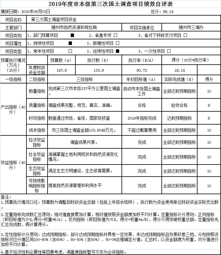 2.效益指标完成情况分,第三次国土调查,将全面获取覆盖全市的国土利用现状信息,形成一整套国土调查成果资料,包括影像、图形、权属、文字报告等成果。同时,将第九次全国森林资源连续清查、全省第五次森林资源普查、第二次全国湿地资源调查、第三次全国水资源调查评价、第二次草地资源清查等最新的专业调查成果,以及城市开发边界、生态保护红线、省级以上各类自然保护地界线等各类管理信息,以国土调查确定的图斑为单元,统筹整合纳入随州三调数据库,逐步建立三维国土空间上的相互联系,形成一张底版、一个平台和一套数据的自然资源统一管理综合监管平台。