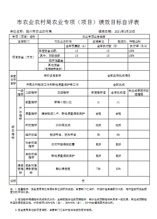 根据预算绩效管理要求,本部门组织对2020年度一般公共预算项目支出全面开展绩效自评,共涉及项目1个,资金15万元,支出15万元,从评价结果来看项目绩效评价综合成绩优良,经济和社会效益良好,财政项目支出合理、规范、有效。