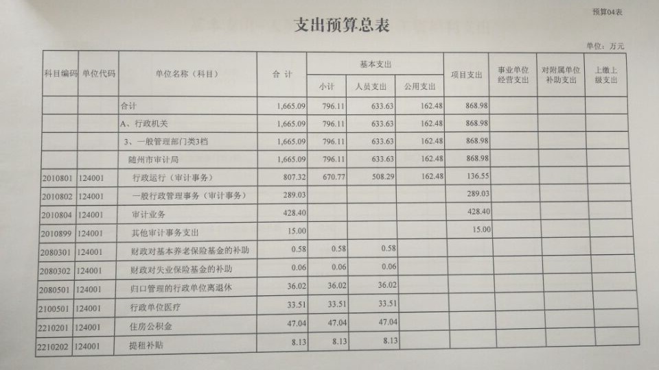 2016年市财政安排我单位公共财政预算1665.09万元。收入部分主要有财政经费拨款483.42万元,纳入预算管理的非税收入(罚没收入)350万元,上年结转安排831.67万元。支出部分包括机关干部职工、退休人员工资福利性支出,商品和服务支出及项目支出。项目支出主要有“金审工程”建设、审计大数据中心建设和审计综合作业平台建设、国家审计署和省审计厅授权交叉审计项目、外聘中介机构审计服务费、办公设备购置和会议室装修等。