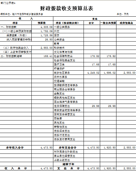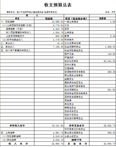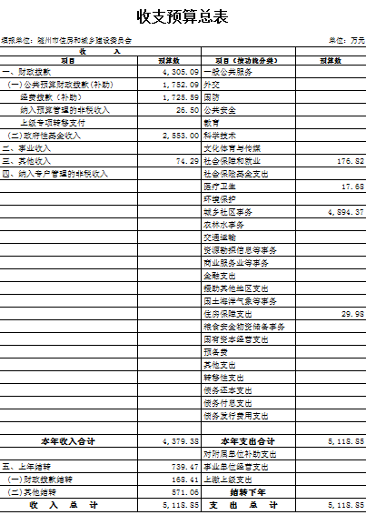 2017年,住建系统部门预算(含所属单位)财政拨款为10956.54万元,其中市住建委本级4305.09万元,包括全市污水处理及设备维护基金2553.00万元、城市维护建设资金1050万元,以及人员经费、公用支出和机关正常运行费用。市住建委本级2017年收入较上年增加2703.00万元,主要为城市维护建设资金增加150万元。