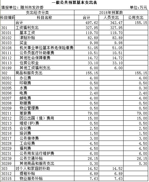 2018年,发改委本级机关一般公共预算公用支出总计155.15万元,比上年减少13.15万元,同比降低8.47%。降低的主要原因是日常一般性公用经费支出减少。其中,办公费4万元;印刷费0.5万元;水费0.3万元;电费2.4万元;邮电费4万元;取暖费0.5万元;物业管理费0.5万元;差旅费79万元;因公出国费用15万元;维修费0.5万元;会议费2.5万元;培训费1.5万元;公务接待费用3万元;工会经费4.5万元;福利费4.5万元;公务用车运行维护费6万元;公务交通补贴26.15万元;其他商品和服务支出0.3万元。