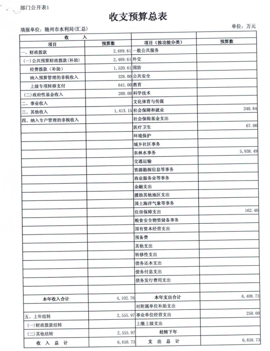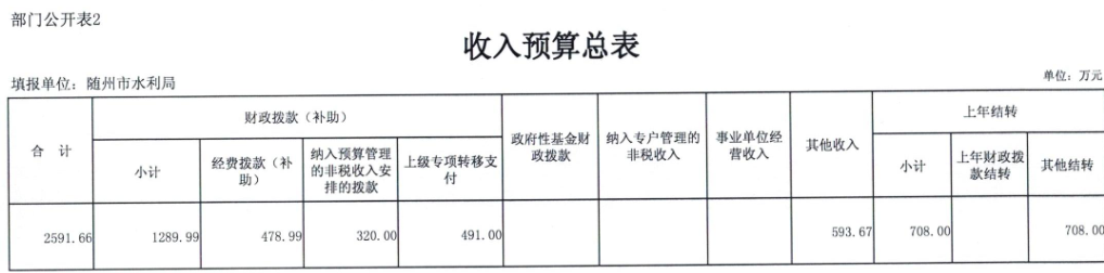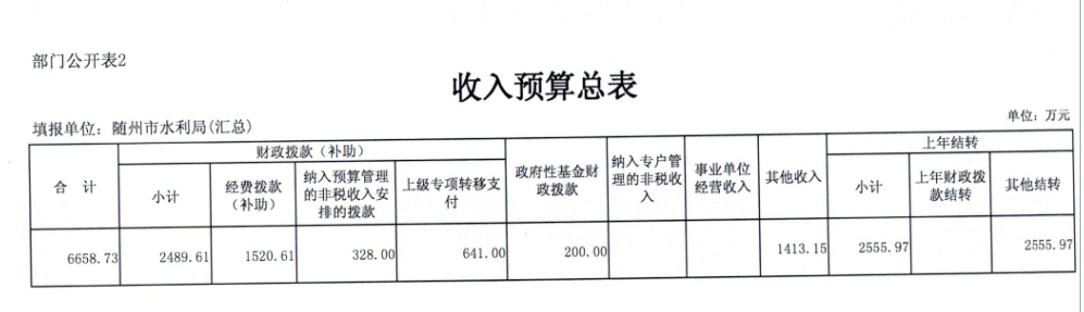 2018年,水利局系统汇总财政收入6658.73万元,其中本年财政拨款(补助)2489.61万元,政府性基金财政拨款200万元,其他收入1413.15万元,上年结转2555.97万元。收入比上年增加351.67万元,增加5.58%,原因:一是2018年增加全面推行河长制项目补助收入;二是增加防汛抗旱信息化建设财政补助收入;三是市水利局及有关二级单位搬迁办公地点,将增加购置部分办公设备及家具以及办公用房装修等。