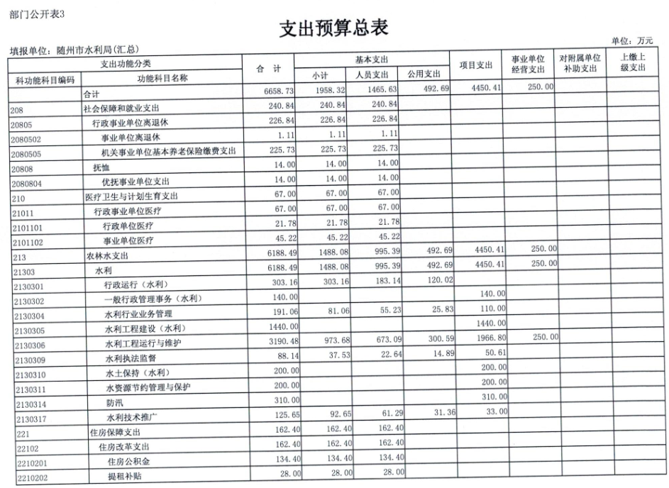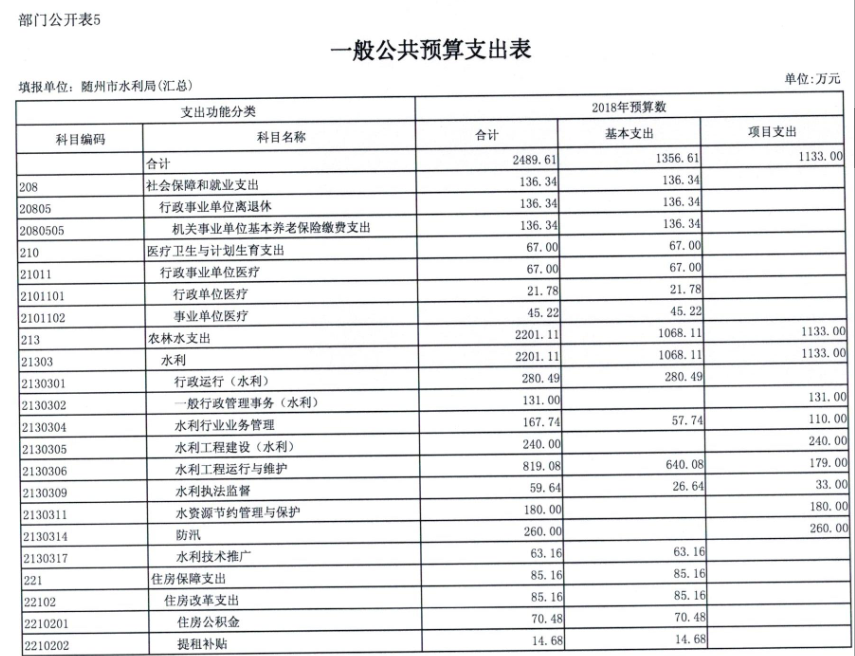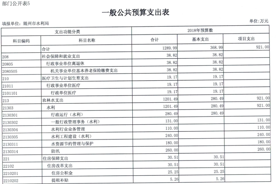 2018年,水利局系统汇总财政拨款支出2689.61万元,水利局本级部门财政拨款支出1289.99万元,比上年增加291.36万元,增加率29.18%,主要是2018年职工增资以及单位水资源项目和增加全面推行河长制项目。