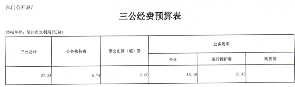 2018年,水利局系统汇总“三公”经费预算27.23万元,增加5.74,增加26.71%。其中公务接待费6.74万元,比上年增3.43万元,增加103.6%,主要原因是:全面推行河长制和鄂北调水二期启动公务接待增加;因公出国(境)费5万元,比上年减3.58万元,减少41.72%,主要原因是:压缩因公出国费用;公务用车运行维护费15.49万元,比上年增5.89万元,增加61.35%,主要原因是:全面推行河长制和鄂北调水二期启动,单位差旅下乡等增加,导致车辆费用增加;无公务用车购置费。