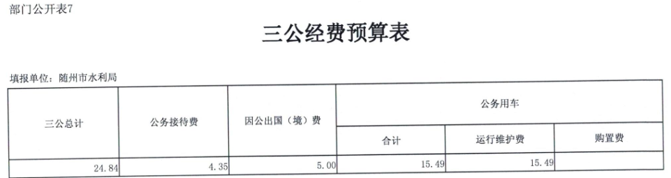 水利局本级部门“三公”经费预算24.84万元,比上年增加5.57万元,增加28.9%。其中公务接待费4.35万元,比上年增加1.98万元,增加83.54%,原因:全面推行河长制和鄂北调水二期启动公务接待增加。因公出国(境)费5万元,比上年减少2.3万元,减少31.5%,原因:压缩因公出国费用。公务用车运行维护费费15.49万元,比上年增加5.89万元,增加61.35%,增加原因:全面推行河长制和鄂北调水二期启动,单位差旅下乡等增加,导致车辆费用增加;无公务车购置费。