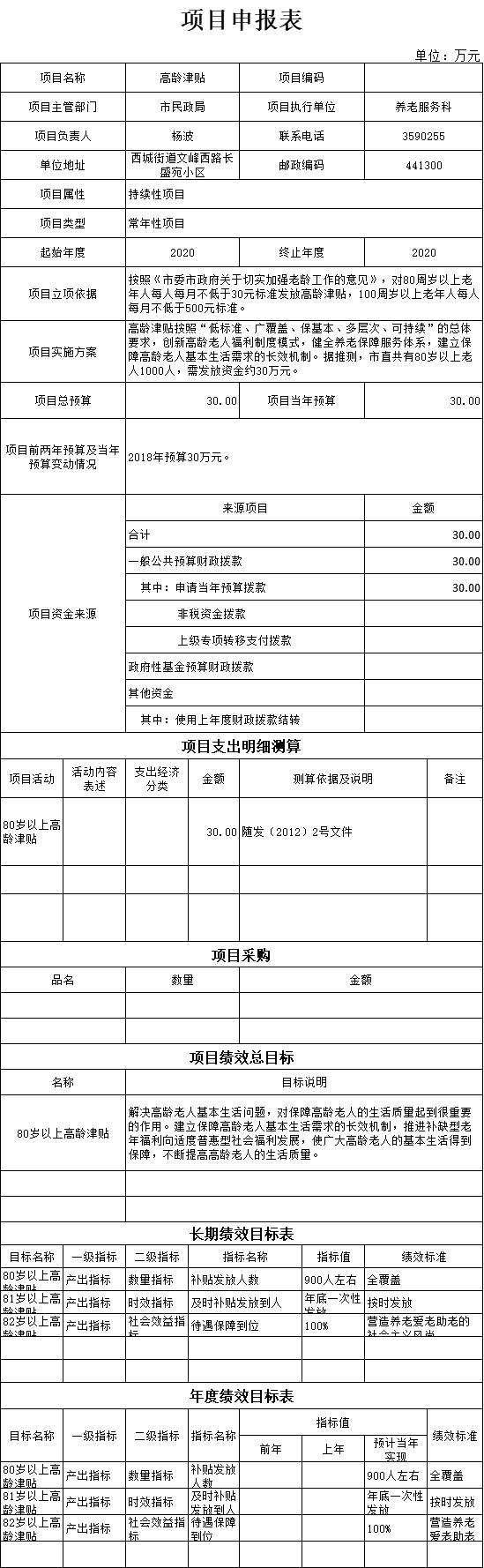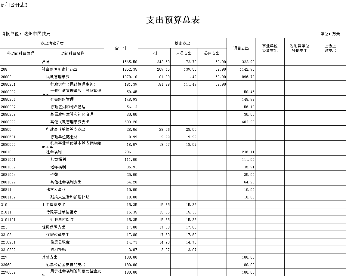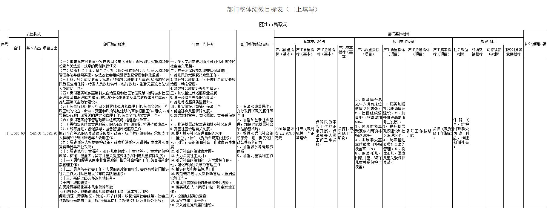 按照财政部门对推进预算绩效管理工作的总体部署,将2020年度预算整体绩效目标公开。民政局部门整体支出预算1565.5万元,其中基本支出242.6万元、项目支出1322.9万元,主要用于保障机关运转及开展养老、社会救助、社会福利、区划地名、社会组织、社工人才等工作。