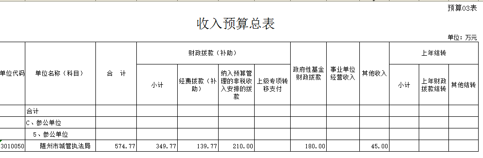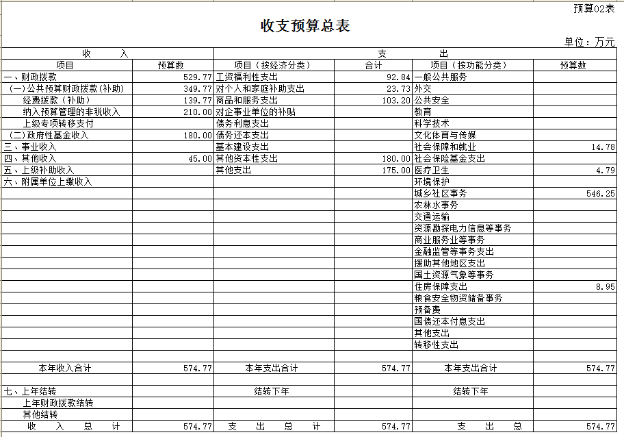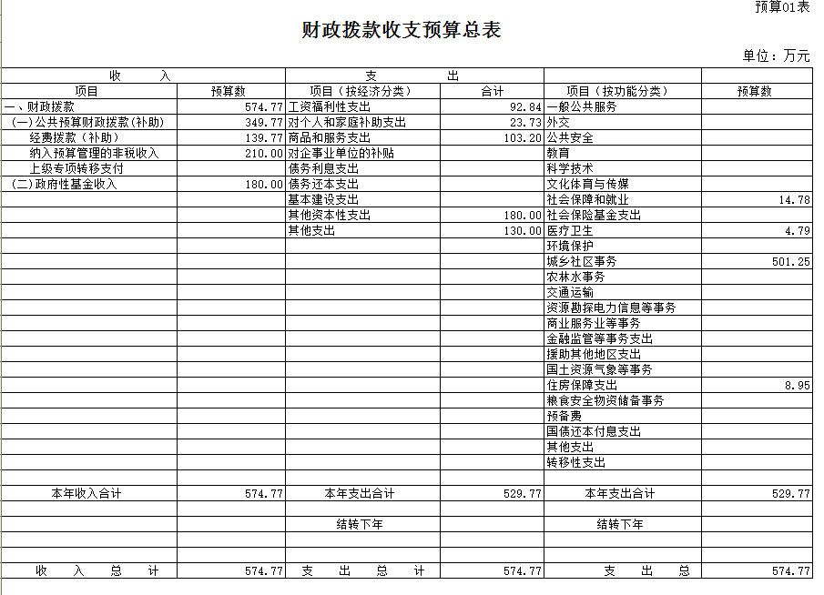 财政拨款为574.77万元,其中公共预算财政拨款349.77万元,政府性基金收入180万元,支出合计529.77万元,其中工资福利性支出92.84万元,对个人和家庭补助支出23.73万元,商品和服务支出103.20万元,其他资本性支出180万元,其他支出130万元。