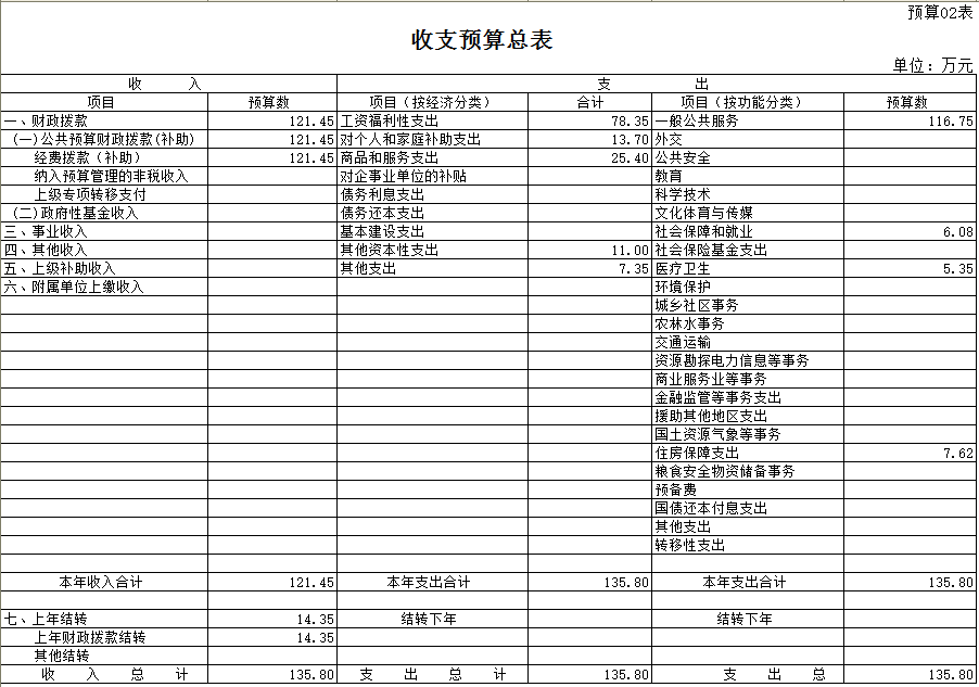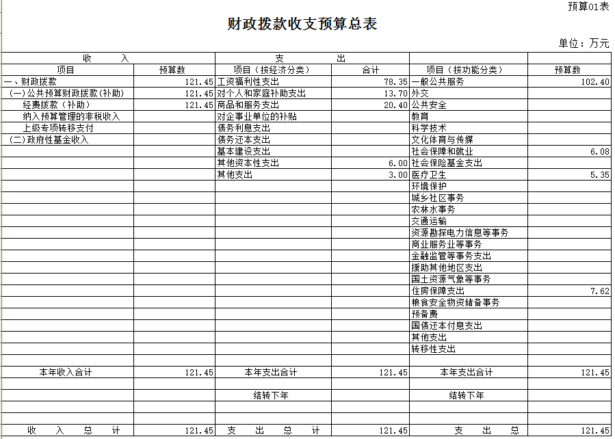 2016年财政拨款支出预算总额为121.45万元,其中:一般公共服务102.40万元,社会保障和就业6.08万元,医疗卫生5.35万元,住房保障支出7.62万元。